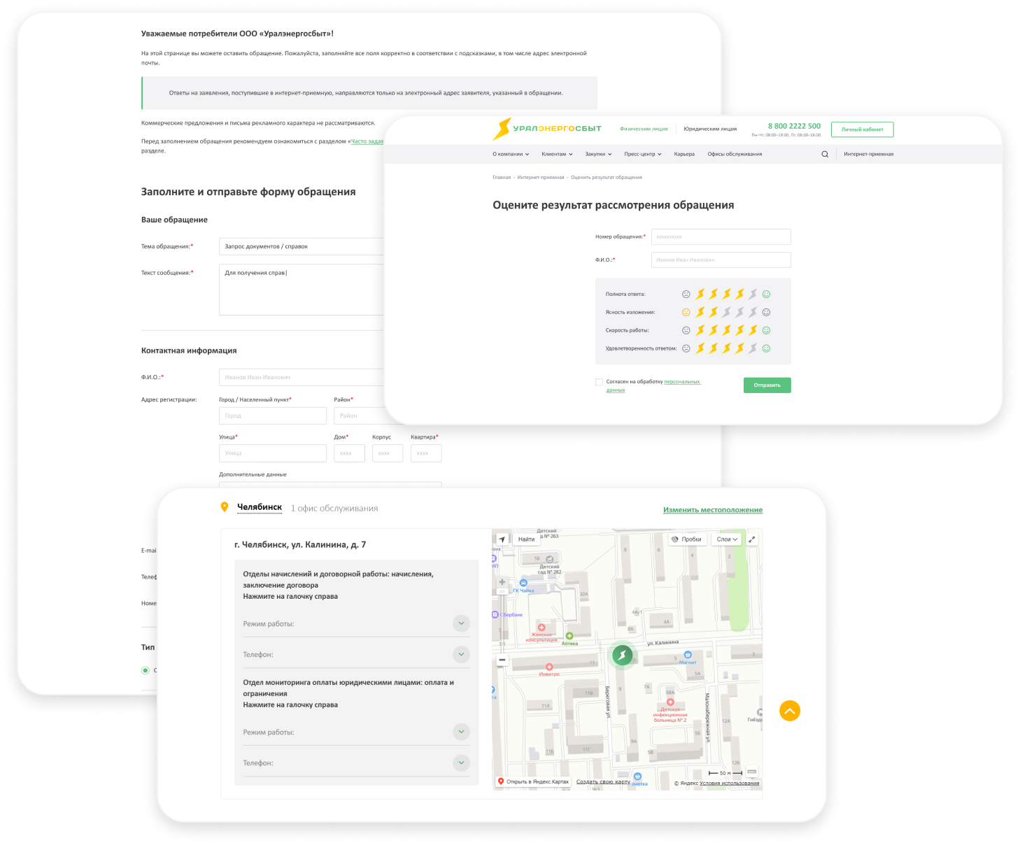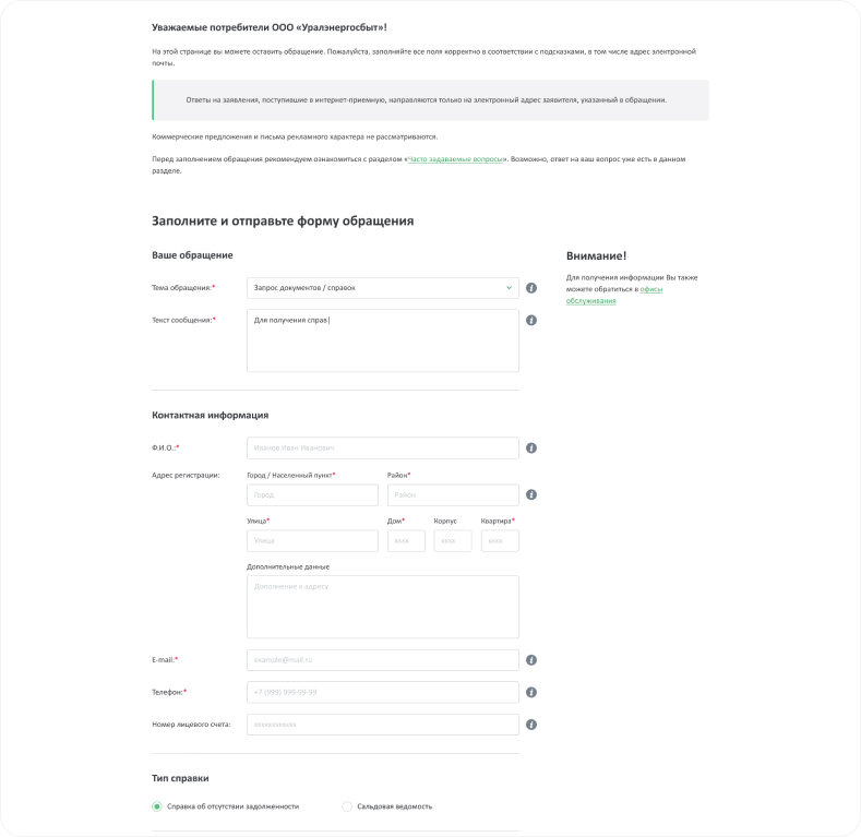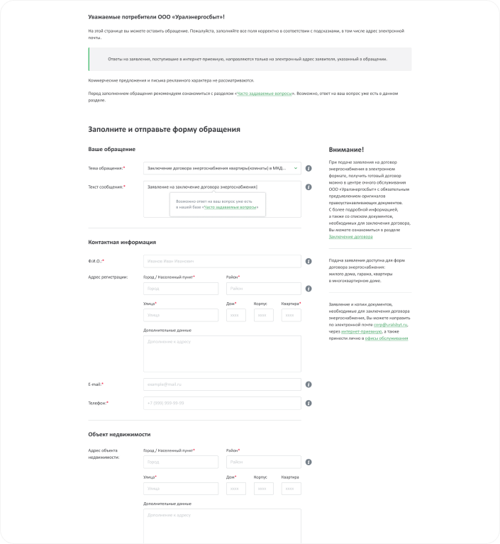 Все обращения разделены на темы, за каждой темой закреплен ответственный сотрудник Уралэнергосбыта. У пользователей есть возможность отправить свое обращение через сайт, не приходя физически в офисы Уралэнергосбыта. Для этого им необходимо выбрать тему обращения и заполнить все необходимые поля в появившейся форме.