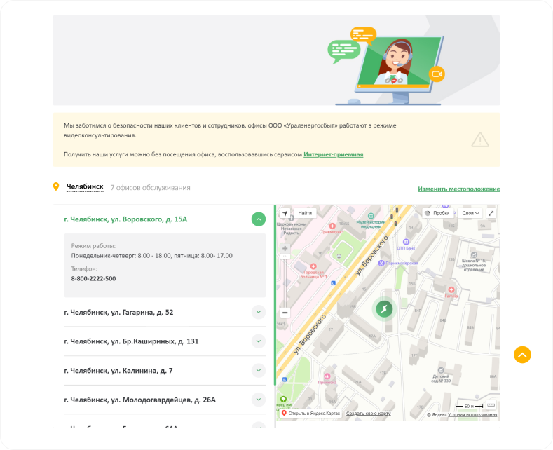 Для бизнеса контакты разделены на Отделение ООО «Уралэнергосбыт» и на Адреса очного обслуживания клиентов.