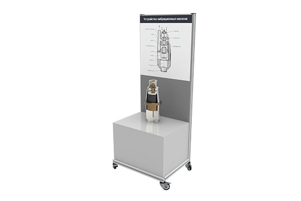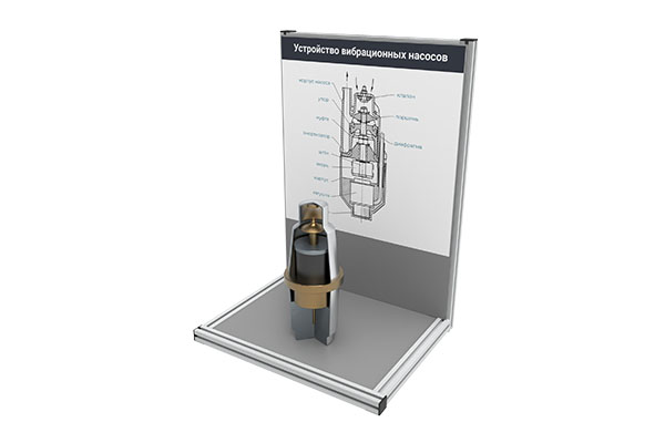 Представляет собой планшет, с закрепленным на нем насосом в разрезе и текстовой информацией о конструктивных элементах. Планшет может быть размещен на столе или стене, с использованием специальных креплений, входящих в комплект поставки. В комплект входит методическое пособие с подробным описанием устройства, принципа работы и сфер применения представленного насосного агрегата.
